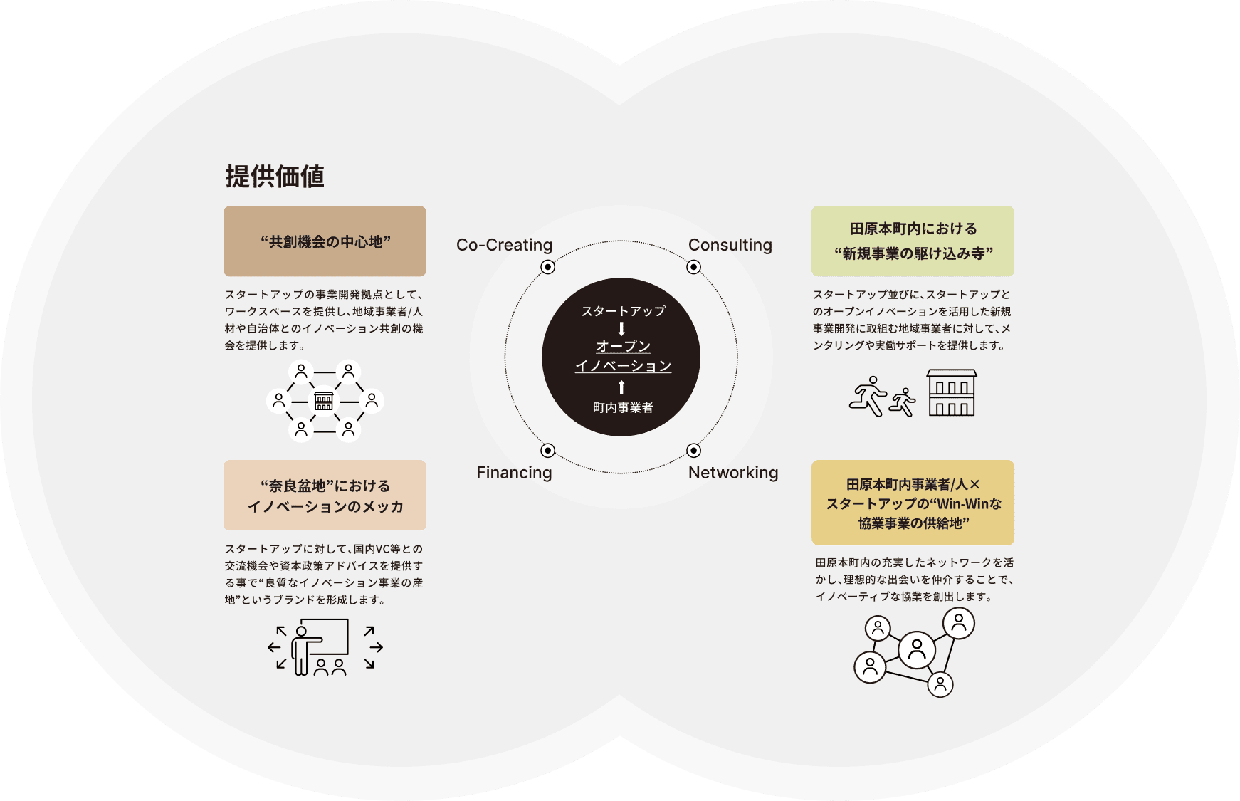 本拠点の提供及び、取引先等を中心とした豊富なネットワークから、スタートアップとの協業先を探索し、マッチングを支援